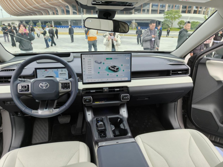 中控15.6寸屏幕,配高通8155P芯片,分辨率达到2.5k水平。更重要的是边框终于不再“丰田”——只有7.5mm的宽度。不过UI界面设计还是很丰田,一切都以好用为主。