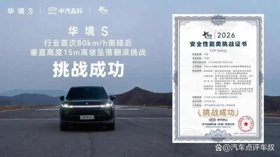 此次中汽品科TOP Safety证书,不仅是对华境S 极端工况安全性能的肯定,更标志着其构建了 “主动预防 - 被动防护 - 电池安全 - 救援响应” 的全链路安全体系。