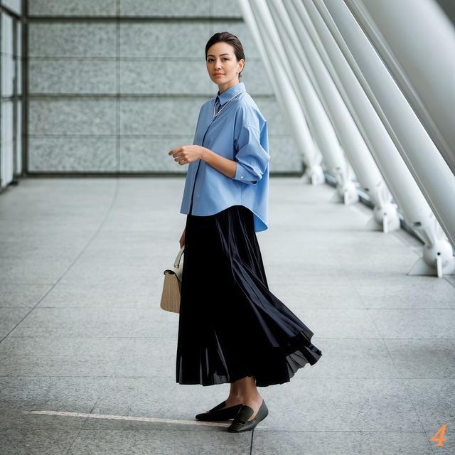 通勤穿搭最怕无聊,西裤+衬衫穿了一周,想必你自己都审美疲劳了!这个时候,你把下半身换成一条黑色缎面百褶裙试试,同样的浅蓝衬衫,但上身效果完全不一样了,裙子的光泽和褶皱给搭配加了很多细节,干练的职场气质,还保住了裙装的灵动。