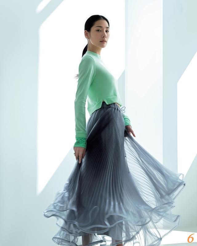 ▶ 薄荷绿贴身长袖+灰蓝细褶纱裙,裙摆飘起来特别上镜