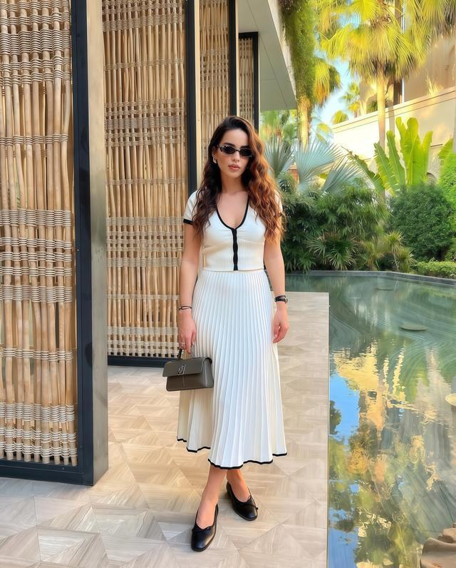 选百褶裙的时候,腰线高低比颜色还重要。高腰款把腰线提到肚脐以上的位置,下半身的比例直接变长,不需要穿高跟鞋也能显高,再把上衣塞进裙腰里,这身搭配的完成度会高很多。