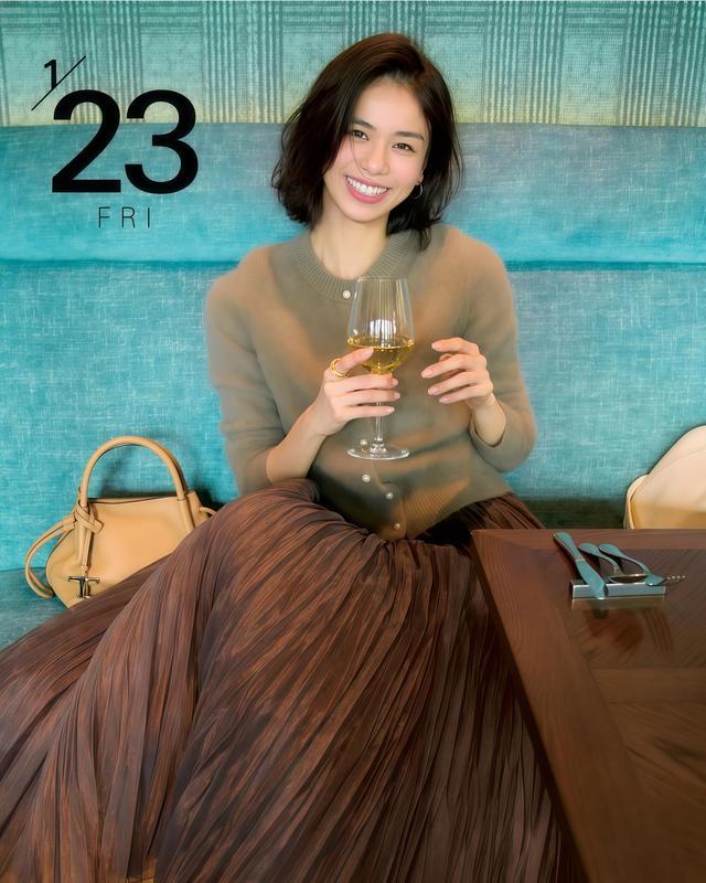 驼色针织开衫配深棕色纱质百褶裙,颜色从上到下在同一个色系里做了深浅过渡,这种搭法最大的好处就是和谐,你不需要担心撞色翻车,整套穿出来的效果温柔耐看,春天穿这一身颜色,走在街上真的很舒服。