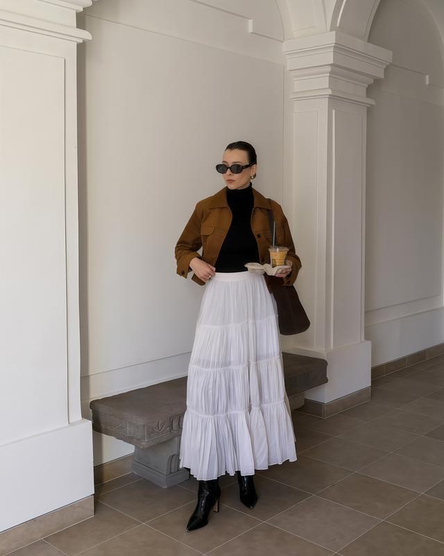 ▶ 棕色短夹克+白色层叠褶皱裙,短外套卡在腰线更显腿长