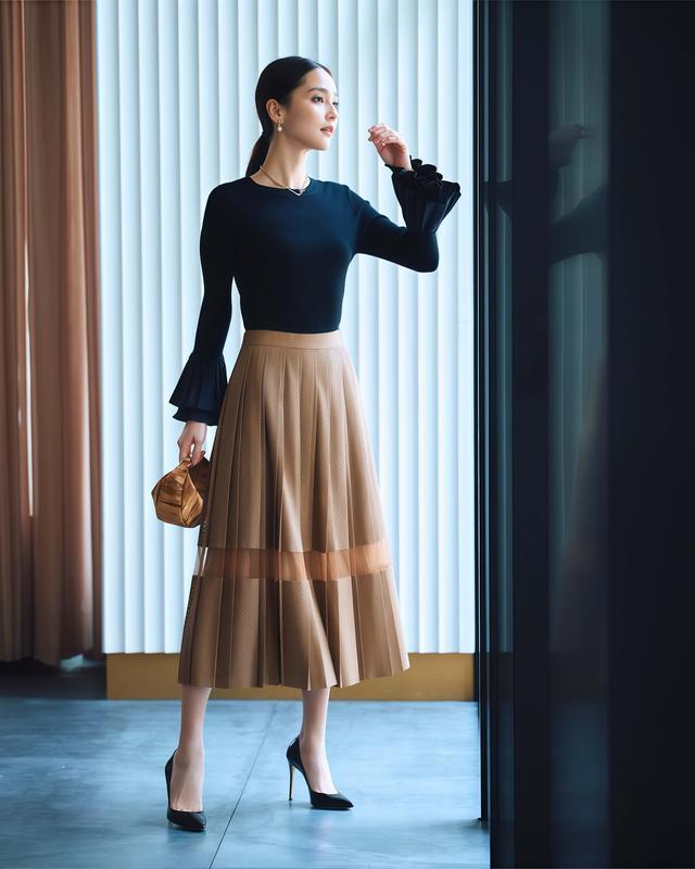 ▶ 黑色修身针织+驼色宽褶裙,打造不费力得体面