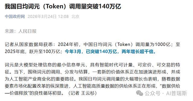 今天,中国政府网转发人民日报援引自国家数据局的文章显示,我们日均词元调用量突破140万亿。