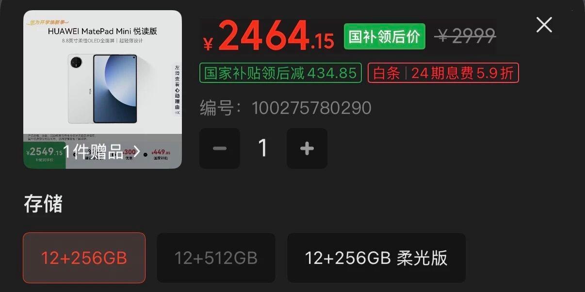 12GB+256GB 悦读版,2464.15 元12GB+256GB 柔光屏 悦读版,2899 元