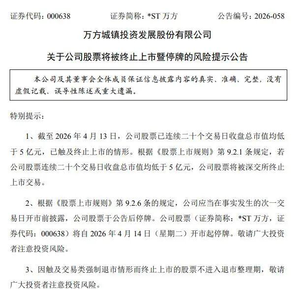 ST万方称,根据《股票上市规则》第9.2.6条的规定,公司应当在事实发生的次一交易日开市前披露,公司股票于公告后停牌。公司股票(证券简称:ST万方,证券代码:000638)将自2026年4月14日(星期二)开市起停牌。敬请广大投资者注意投资风险。